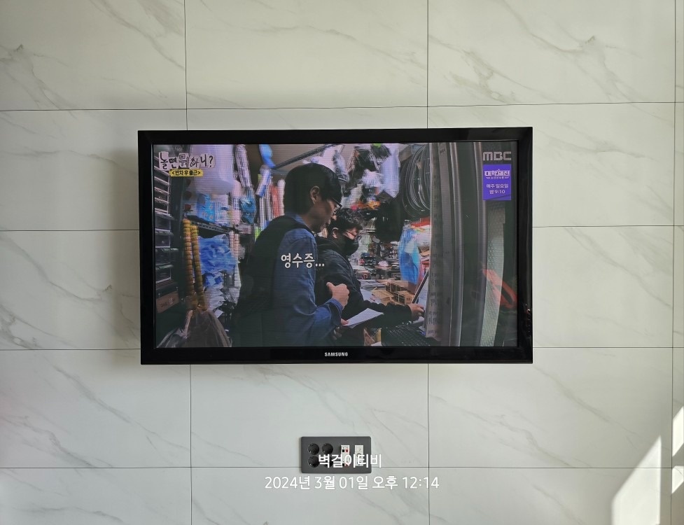 콘센트 일부를 제거하고 전용장비를 이용해 TV를 견고하게 고정하는 방식으로 시공과정이 진행되었습니다. 저는 전문가가 아니고 자세한 기술은 모르지만 작업과정을 옆에서 지켜보면서 작업자들의 경험과 실력이 어느 정도인지에 따라 고정력이나 설치의 완성도가 크게 달라질 수 있다고 생각했습니다. 세부 사항에 대한 관심 수준.