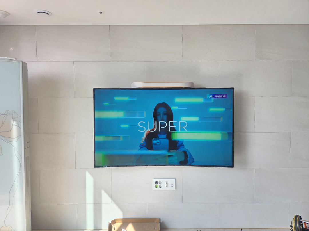 콘센트 일부를 제거하고 전용장비를 이용해 TV를 견고하게 고정하는 방식으로 시공과정이 진행되었습니다. 저는 전문가가 아니고 자세한 기술은 모르지만 작업과정을 옆에서 지켜보면서 작업자들의 경험과 실력이 어느 정도인지에 따라 고정력이나 설치의 완성도가 크게 달라질 수 있다고 생각했습니다. 세부 사항에 대한 관심 수준.