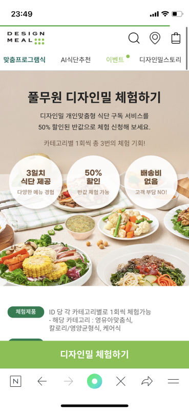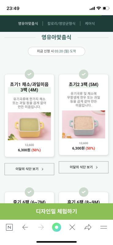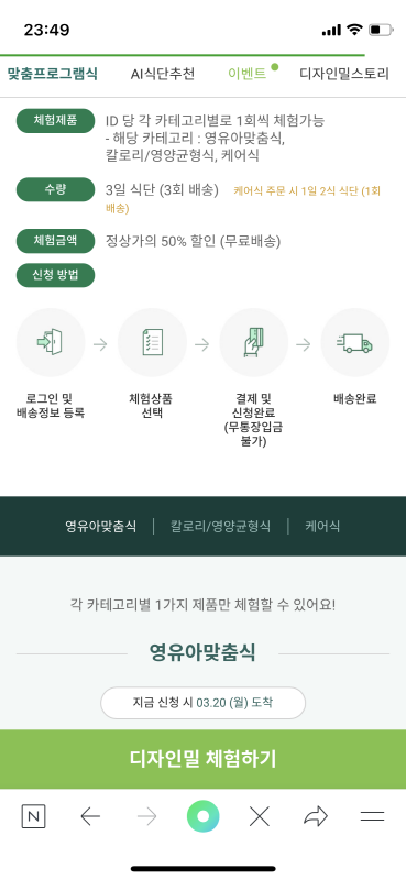 풀무원디자인식은 다른 이유식 업체와 달리 영유아식 외에도 당뇨, 암, 시니어, 다이어트 등 다양한 다이어트 프로그램을 판매하고 있습니다. 그래서 태국 이유식 회사들은 무료 체험을 제공하지만 “나는 내 길을 가고 있다”는 느낌으로 반값 체험을 제공합니다. 이유식 외 다른 식사(간병식, 시니어식, 다이어트식)를 반값으로 체험할 수 있으며, 1회 최대 3회 반값 체험을 할 수 있다.