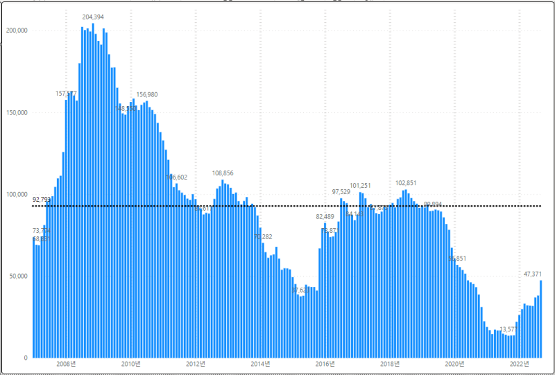2023년 1월 말 기준 인천 미분양 아파트 현황을 살펴보겠습니다. 인천 미분양 아파트 그래프입니다.